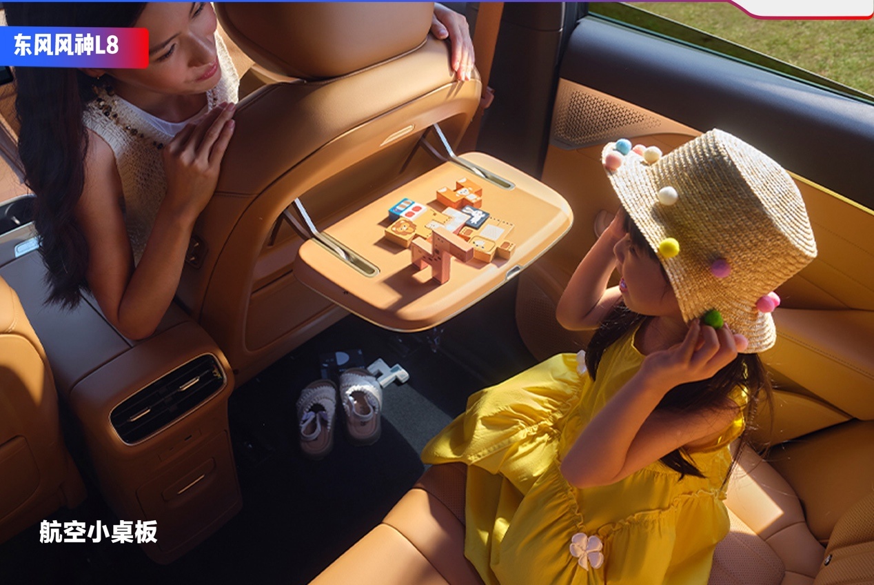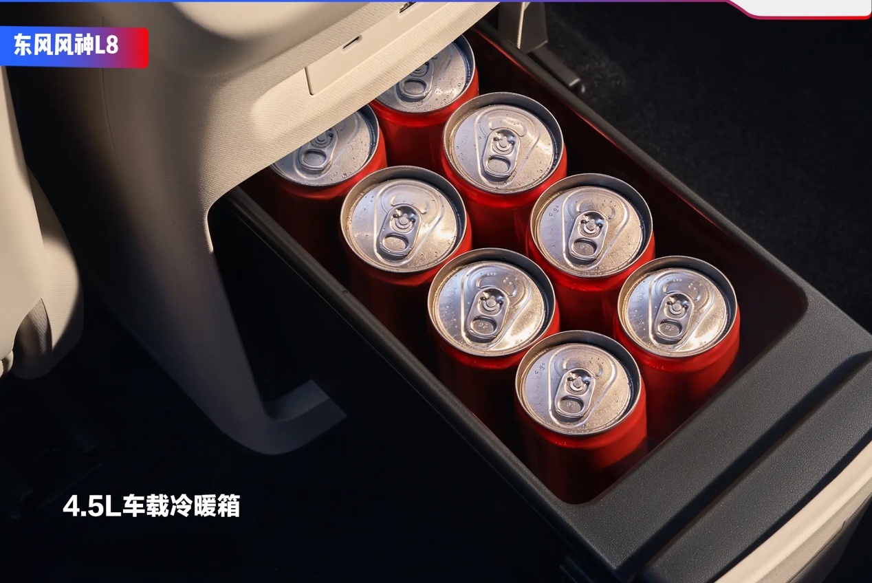 然后除了照顾司机,更值得一提的是风神L8的“家庭友好配置包”:后排15.6英寸的2.5K吸顶娱乐屏、同级唯一的19扬声器WANOS全景声音响,连主驾都带有“头枕音响”。还有车载冷暖箱可保温母乳或冷藏饮料,搭配后排航空级小桌板,后排瞬间变身“移动育儿室”或“办公间”。