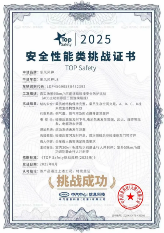 风神L8依托东风央企军工技术积淀,构建了远超同级的安全体系,车身采用高比例高强度钢打造笼式结构,其自家的马赫电池更是4重电芯强化,在此前经历全网首次三面连续高速碰撞试验,ABCD柱结构完好,电池结构稳定、“零起火”的安全表现,为全家筑牢被动安全屏障。