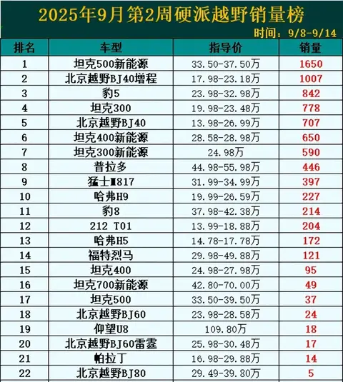 2025年9月第二周的硬派越野车市,空气里都透着股火药味。坦克500新能源忽然窜起,两周连冠,单周卖出1650辆,这可是一台均价超30万的国产车,能冲到这个位置,真不是闹着玩的。谁也没想到,原本稳坐C位的豹5这次栽了跟头,眼睁睁看着自己被北京越野BJ40增程版反超,连前三都没挤进去。更尴尬的是坦克300,曾经的销量常青树,这回连前3都碰不着,只落了个第四。