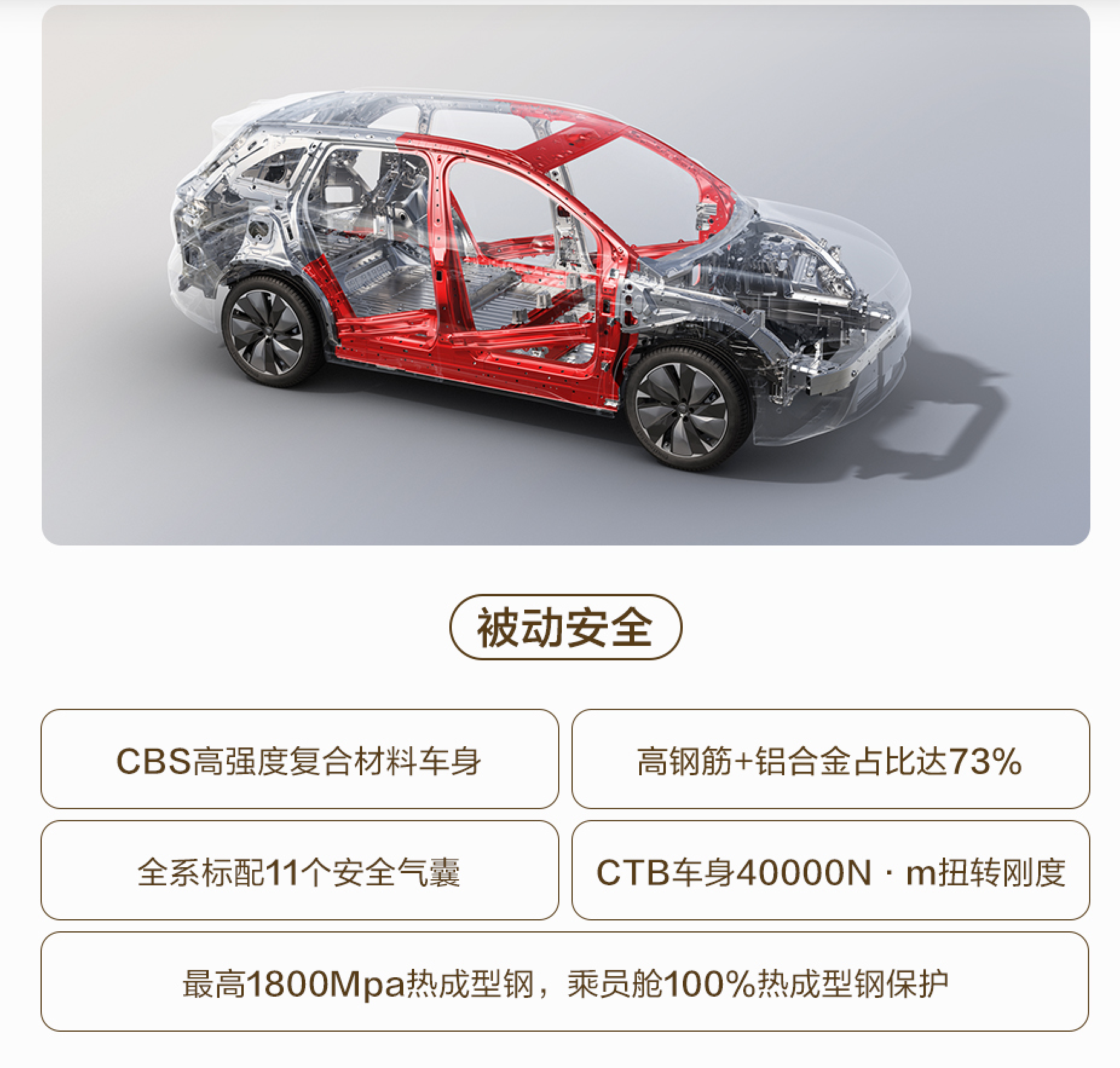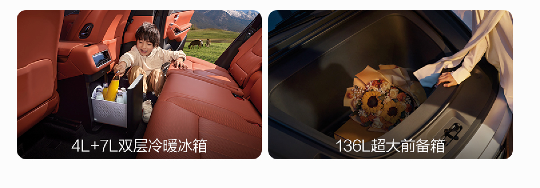 储物空间采用分层设计,常规状态下270L后备厢+136L前备舱的组合,足以容纳露营装备、母婴用品等等,后备厢放倒第三排座椅可以扩展到960L,放倒第三三排可以扩大到1960L,扩展能力出色。更关键的是其搭载的CTB一体化车身技术,既保证车内空间利用率,又提升车身刚性,避免纵置电池布局带来的空间取舍问题。