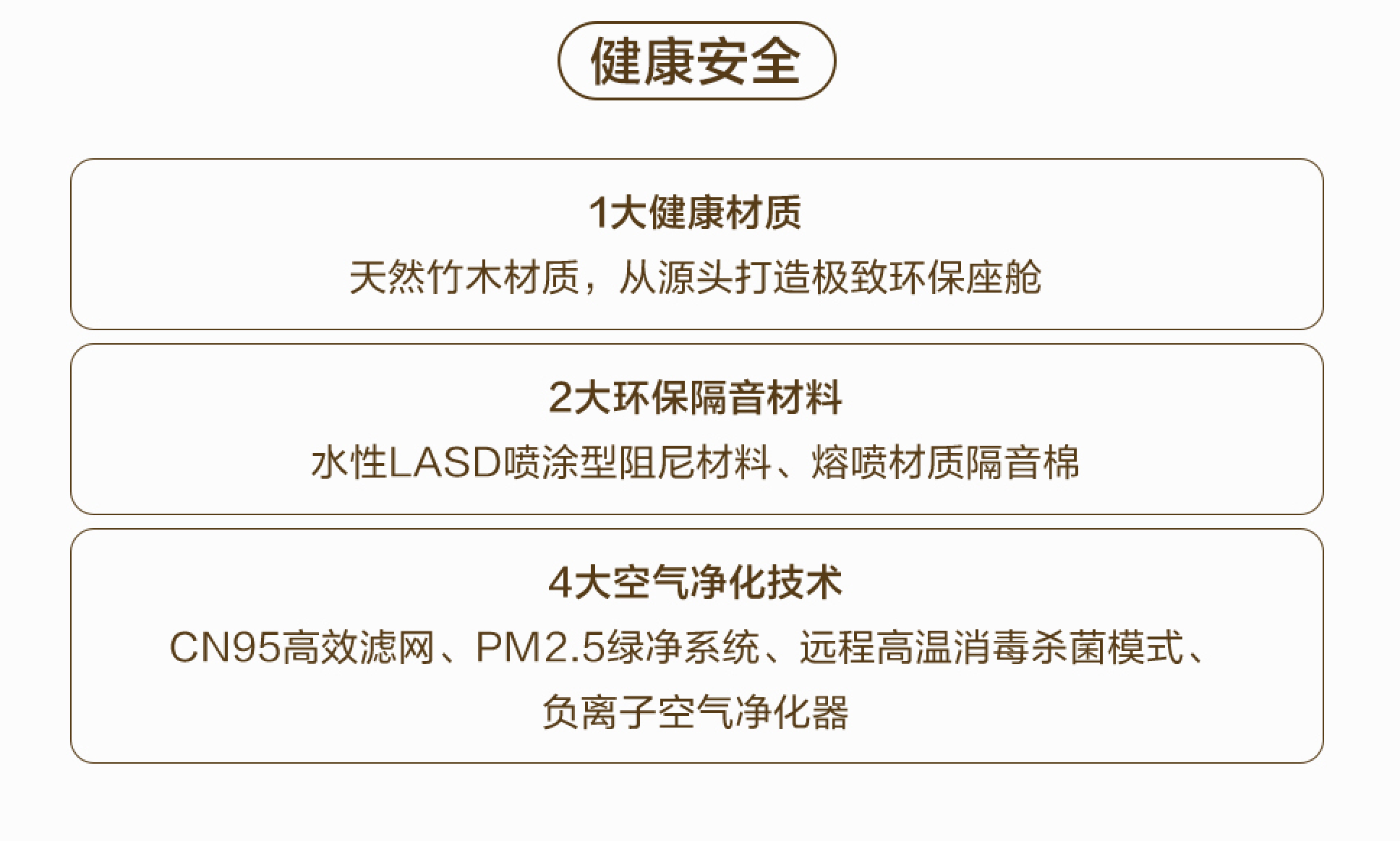 车内3D竹木饰板搭配环保真皮材质,不仅质感高级,更实现新车无异味,兼顾美观与健康,对于有老人和孩子的家庭来说尤为重要。配置方面,其坚持“标配即满配”的原则,无任何付费订阅项目,长期用车无需担心额外支出。
