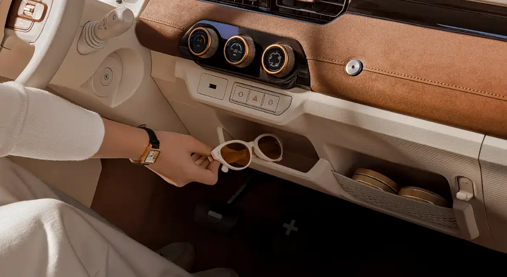 再看座舱内部,QQ冰淇淋女王版在设计上融入了“纽扣、翻毛皮、皮革、金属装饰”等元素,咖色装饰搭配乳白色软包材质,营造出一种温馨舒缓的座舱氛围。此外,座椅还采用了都市女性钟爱的皮革手提包刺绣纹样,头枕下方采用镂空设计,表面保留“ice Cream”车型标识,增强了车型的辨识度。对比传统微型代步车,冰淇淋女王版的内饰质感有一定改善,但仪表台下方仍有大面积的硬塑料材质,对整体档次有一定影响。同时,新车为保留良好的空间利用率,采用了常见的网袋储物、中置储物格等设计,新增纽扣拓展孔或许可以加装官方配套的手机支架、小风扇等配件。