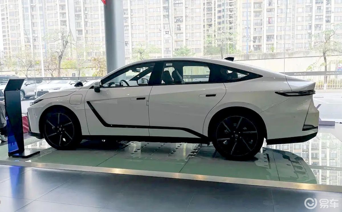 车身侧面也是见棱见角,车顶后方采用溜背式设计。腰线设计由前向后笔直上扬,与车门上的黑色装饰条衔接,整体线条让车身侧面视觉效果更显修长。充电口位于前翼子板位置,车门把手为半隐藏式设计。实拍车型配备了21英寸轮圈,搭配235/45 R21轮胎。