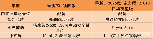 此外,星越L揽星版同样配备内置行车记录仪,在基础配置上与瑞虎9X领航版不相上下,但在高阶配置和智能科技方面,与瑞虎9X领航版的差距较为显著。