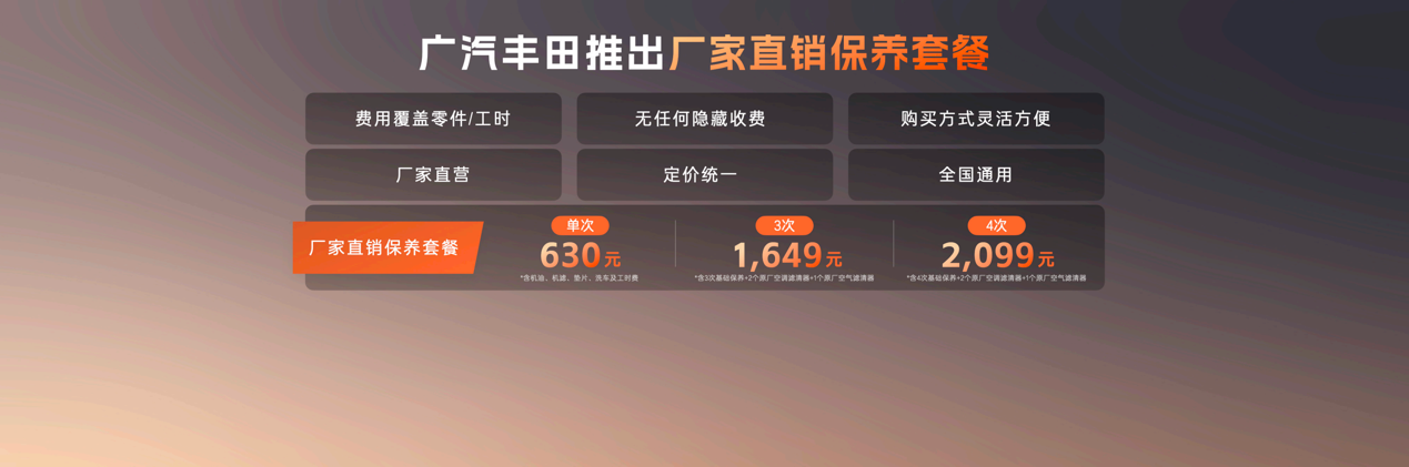 广汽丰田推出的“厂家直销保养套餐”,可以按需购买,且费用完全覆盖零件与工时,没有隐藏收费,可以说是透明的兜底服务了,并且用的也是原厂直供零件,有原厂技术标准保证,服务全程也是在厂家授权4S店进行,这个价格和服务标准比第三方保养“香”多了。