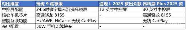 在芯片配置上,瑞虎9耀享版和昂科威Plus2025款均搭载了高通骁龙8155芯片,能够确保车载系统的流畅运行,支持多任务处理和复杂功能的快速响应。而途观L 2025款出众款在这方面的配置相对平庸,体验感相对打折扣。