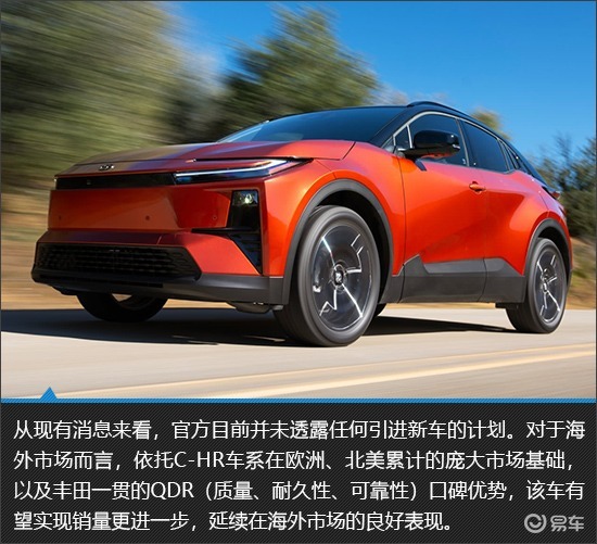 总结来看,2026款丰田C-HR BEV作为纯电系列迭代新作,以全面焕新的姿态登陆海外市场。新车在外观上彰显动感个性,内饰兼顾科技感与实用性,动力搭载双电机四驱系统,核心产品力全面提升。虽与国内市场无缘,但依托丰田品牌良好口碑及C-HR车系在海外的深厚基础,这款务实且兼具性能的新车,有望在海外市场持续发力,完善丰田电动化布局。