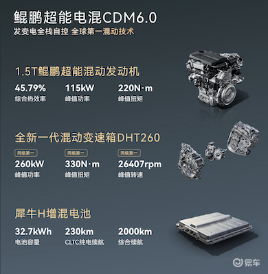 在性能与驾控层面,风云T9L搭载鲲鹏超能电混CDM6.0系统,实现综合续航超2000km,CLTC纯电续航230km,馈电油耗3.9L/100km,零百加速5s级,系统综合功率550kW,配备双电机智能四驱布局。该系统搭载1.5T混动专用发动机,热效率达45.79%,搭配全新一代DHT260混动变速箱,全系标配鲲鹏AI能量管理系统。车辆配备6+1种全地形驾驶模式,搭载雪豹智能四驱系统,配备飞鱼底盘与CDC电磁悬挂,转弯半径5.95m,兼顾驾控性能与通过性。