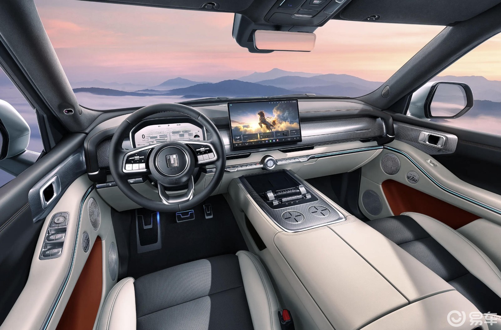 内饰秉持"天地有序"的东方理念,以"麒麟之脊"中轴线打造对称式座舱。全车腰线以上采用高克重麂皮绒包覆,触手温润;仪表板、门板等区域采用超纤皮材质,中控台配备航天级真铝饰板。