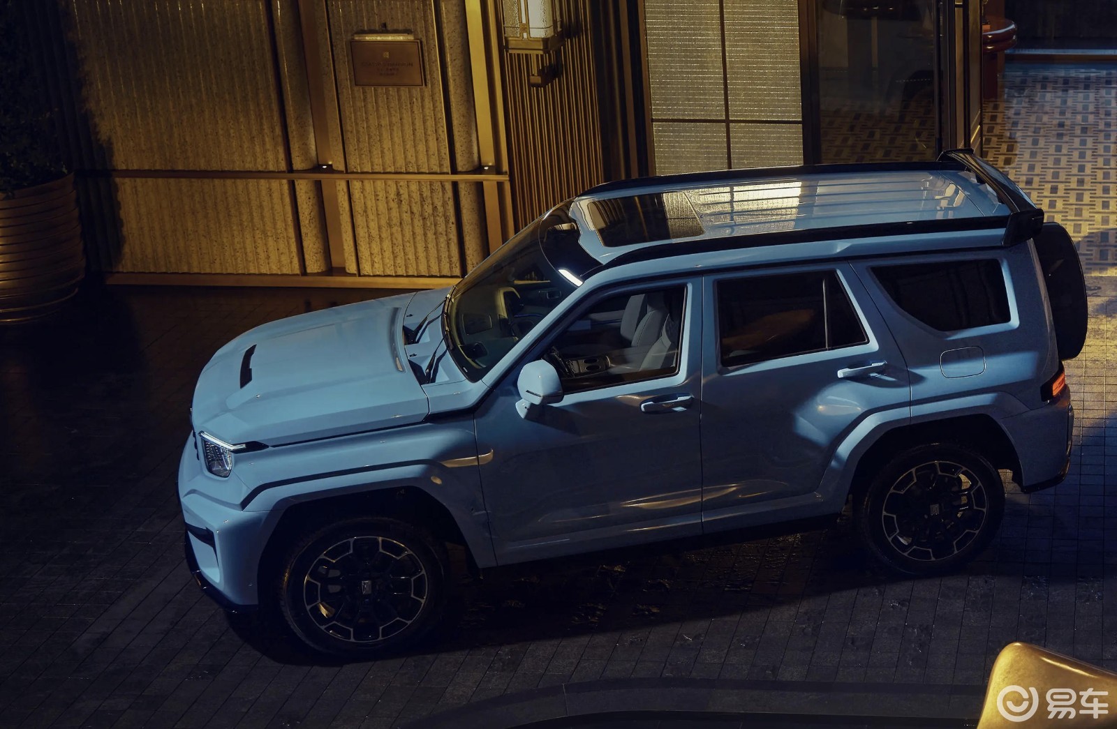 车身尺寸为5105×2061×1985mm,轴距3000mm,车身高宽比接近1:1。坐姿最大离地高度可达1003mm,高于牧马人、丰田兰德酷路泽、奔驰G级等硬派越野车型。前上下视野合计21°,A柱障碍角4.8°,盲区更小,视野开阔。
