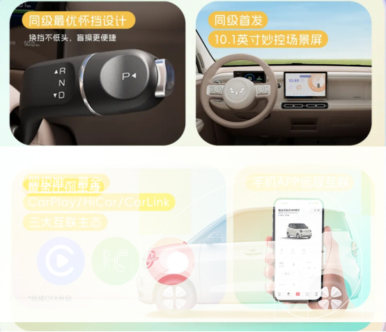 宏光MINIEV第五代外观内饰的设计风格,采用了“甜趣方糖”的设计语言,圆润的方形轮廓配上类似笑脸的前脸和圆环状的大灯,整体给人的感觉是萌趣、亲和,不张扬但又有点精致感。提供的绿悠悠、白绒绒、灰萌萌三款车色,名字听起来就很生活化,颜色也不是那种高饱和度的扎眼色调,带有复古的质感。内饰方面,“焦糖奶油”的撞色搭配和副驾驶前方那块可以自由摆放手办的“百变造景空间”,确实是个能让人会心一笑的设计——你可以把这里布置成自己喜欢的模样,让车真正变成属于自己的移动小天地。