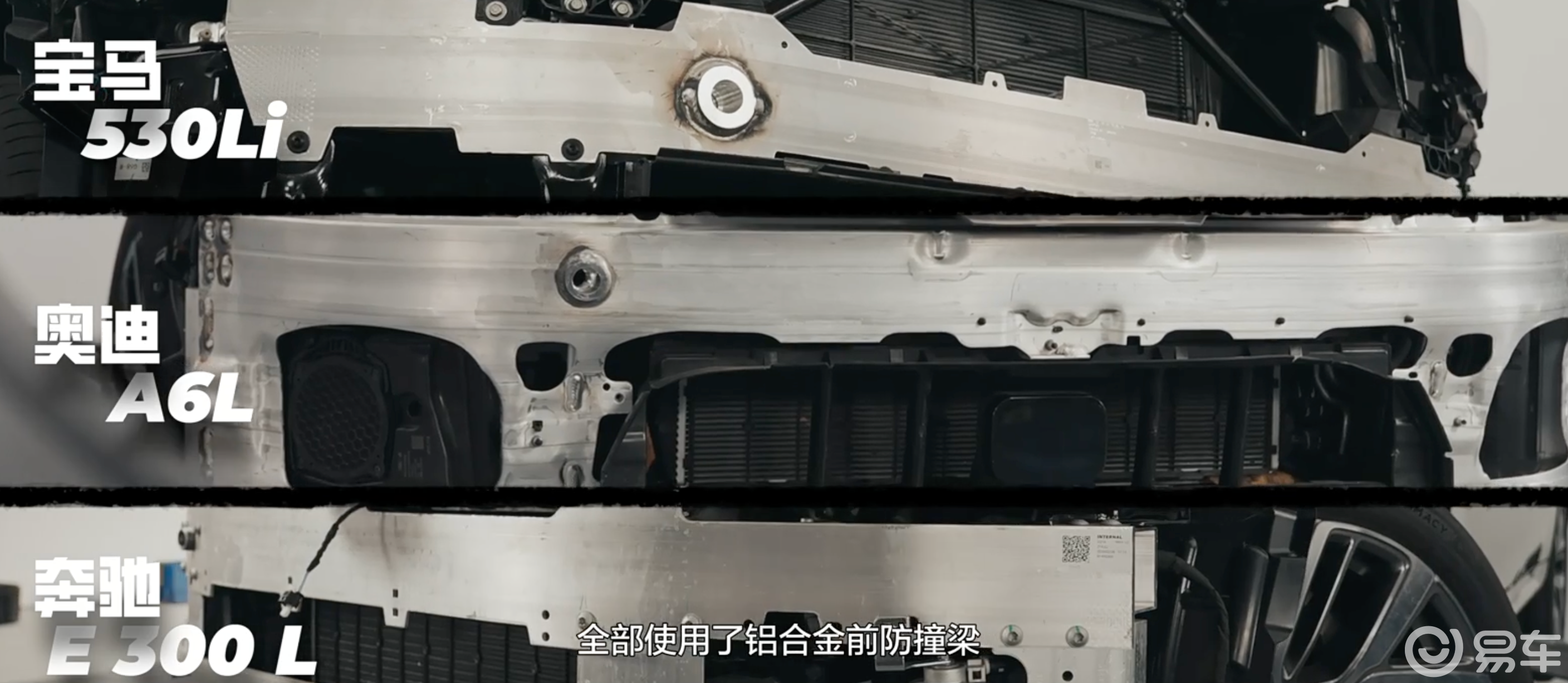 奔驰E级 2026款 改款E 300 L的防撞梁采用四条日字型框架结构,有着不错的整体强度,只是并没有在防撞梁中间安装导风板,散热方面会有一定影响。宝马5系 2026款改款530Li的防撞梁覆盖了水箱、头灯下边的支脚,整体的保护更加充分,前方有水箱散热导风出口,橡胶框架外还覆盖了一层复合材料,减少了金属部件和前包围之间的摩擦。