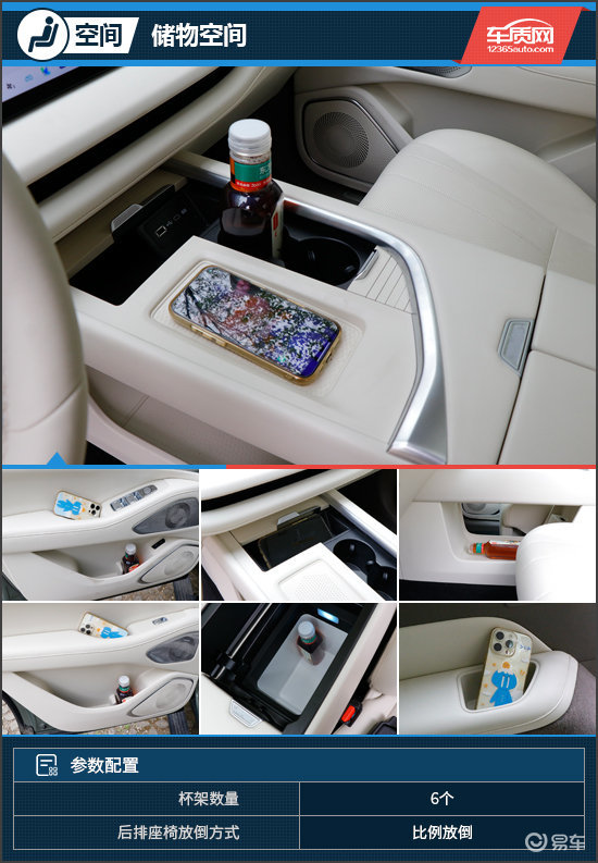 储物空间方面,前排扶手箱前方有一个50W手机无线充电板,右侧是两个带限位器的水杯架,再往前则设置了小容量的储物槽。中控台底部进行掏空处理,从而营造出一个容积可观的储物空间。