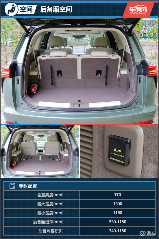 打开后备厢,内部空间十分规整,右侧还提供220V电源接口。常规状态下容积为349L,可容纳2-3个登机箱;将后排座椅按比例放倒后,容积可扩展至1150L,实用性与装载能力表现出色。