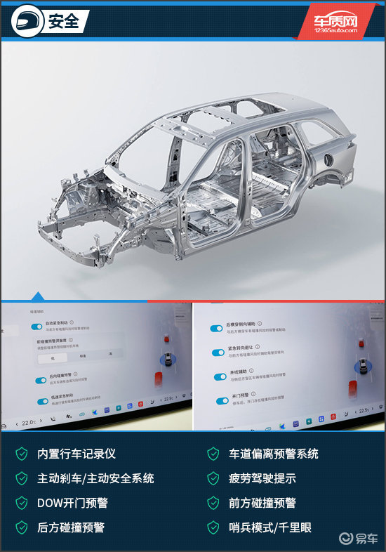 安全配置方面,评测车的主/被动安全配置较为丰富,配备内置行车记录仪、车道偏离预警系统、主动刹车/主动安全系统、疲劳驾驶提示以及前方碰撞预警等配置,能够为日常行驶提供全方位的安全防护。
