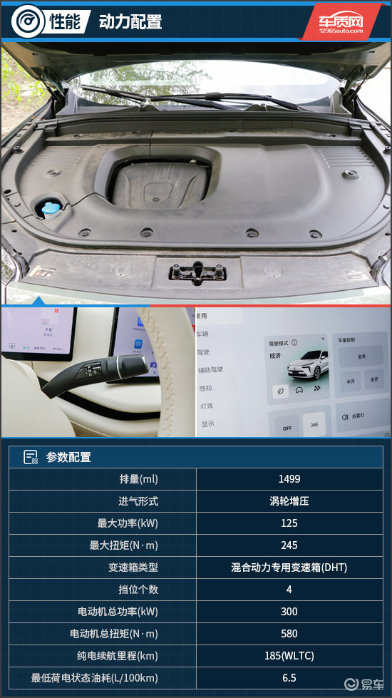 动力方面,评测车搭载由1.5T涡轮增压发动机+双电机组成的插电混动系统,发动机最大功率125kW,电动机总功率300kW,总扭矩580N·m,WLTC纯电续航里程185km。