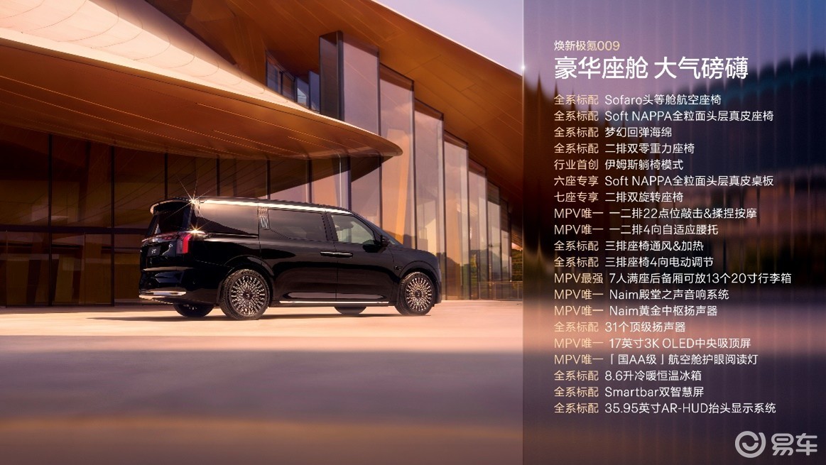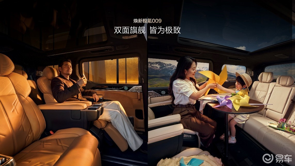 本次焕新极氪 009 共发布三款配置车型,分别为七座 Ultra 版、七座 Ultra + 齐家版及六座 Ultra + 行政版。预售期间,官方推出多重购车权益,总价值至高 8 万元。具体包括:支付 5000 元意向金可抵扣 10000 元尾款;免费选装价值 6 万元的 Naim 殿堂之声音响系统与 8000 元高亮银镀铬格栅;七座 Ultra 版用户可享 6000 元特惠价选装原价 12000 元的二排双旋转座椅;预订用户还将获赠价值 1999 元的极氪专属黄花梨君雅礼盒。此次新增的七座 Ultra+“齐家” 版是车型亮点。命名取自儒家 “修身齐家” 理念,区别于行业常见的直白功能化命名,以东方人文表达精准锚定高端多人口家庭出行需求。此前,极氪 009 六座行政版已在高端商务市场积累良好口碑,此次焕新通过 “齐家” 版切入快速增长的高端家庭用户群体,针对多孩家庭、多人结伴出行等场景,在空间布局与实用便利性上完成优化,填补了豪华 MPV 市场高端家庭向产品的空白。在极氪 009 上市前,国内豪华 MPV 市场长期由传统燃油车型主导,竞争格局固化。作为全球首款原生纯电豪华 MPV,极氪 009 开创了全新细分品类,凭借性能、豪华与安全三大核心优势,确立了新能源豪华 MPV 的行业标准。市场数据显示,极氪 009 已连续两年蝉联中国 40 万元以上 MPV 年度销量冠军,2025 年斩获香港 MPV 销量冠军,并拿下泰国、马来西亚豪华纯电 MPV 销量冠军,累计获得超 6 万高端用户认可,成功打破外资品牌在该领域的长期垄断。焕新极氪 009 在产品力上实现系统性跃升,核心升级聚焦座舱体验、三电性能、底盘配置与智能驾驶四大维度。座舱豪华度方面,全车座椅均标配 Soft NAPPA 全粒面真皮,支持多角度电动调节、通风及加热功能。二排新增双零重力座椅,配备 22 点按摩与揉捏功能及四向自适应腰托;七座 Ultra + 齐家版标配二排双旋转座椅,搭配同级领先的对坐空间与 17 英寸 OLED 中央吸顶屏,打造家庭化交互场景。
